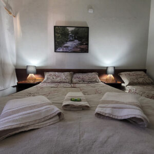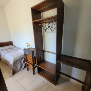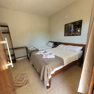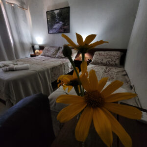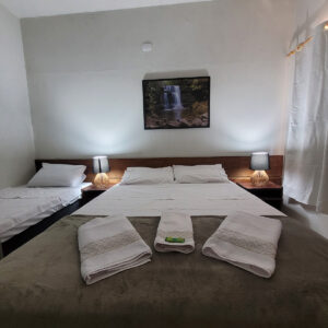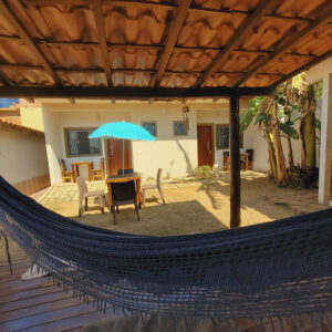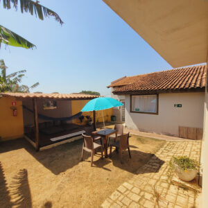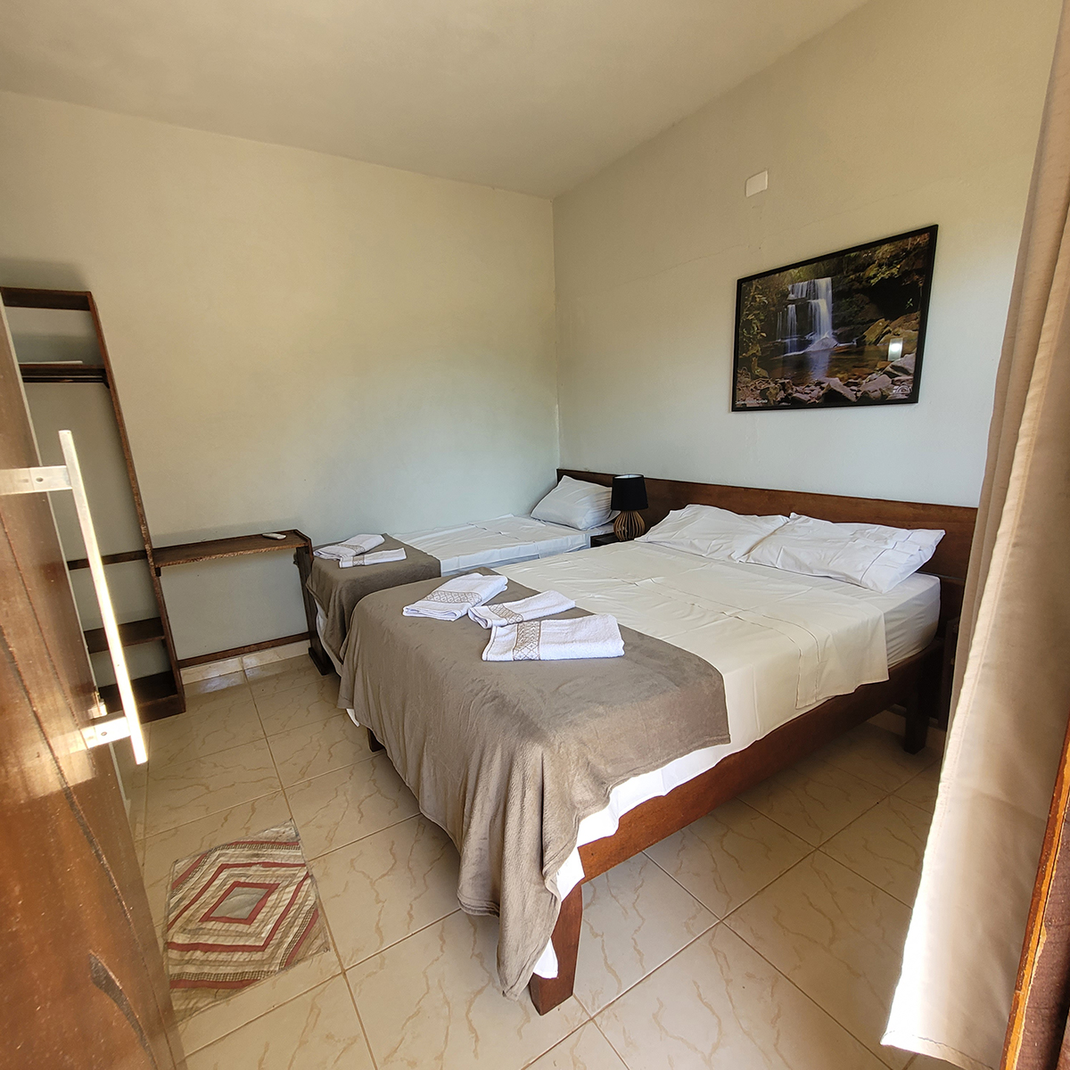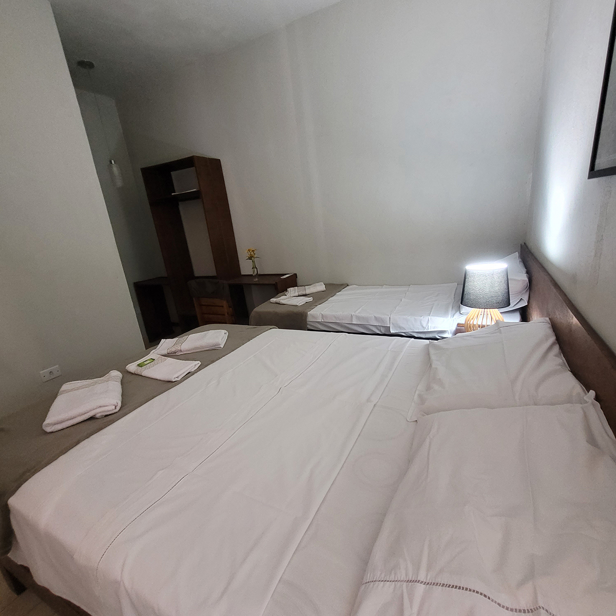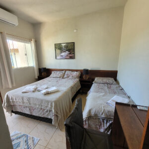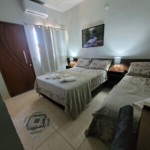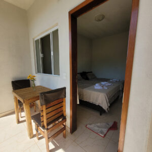 As duas suítes, contem 1 cama de casal e 1 cama de solteiro, ambas equipadas com ar condicionado e internet WIFI. Quartos com 15 metros quadrados e uma pequena varandinha com mesa e duas cadeiras,  com um espaço de 3 metros quadrados.